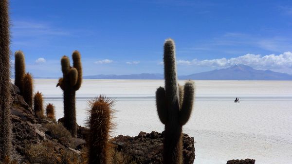 In Bolivia fietsen we voortdurend op een hoogte boven de 3.000 meter. Ronduit surrealistisch is hier Salar de Uyuni, de met 10.582 km² op één na grootste zoutvlakte ter wereld.